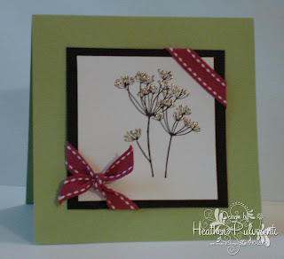 I started with a 4 1/4" square card base of Certainly Celery CS and a 2 1/4" square piece of Basic Black CS. I stamped my Garden Silhouettes image in Basic Black on Whisper White CS, then trimmed it to fit. I adhered the image onto the Basic Black square, and attached the Purely Pomegranate Double Stitched Ribbon. Once that was finished, I attached the layer to my card base and used my Sakura Glitter Pen to give the flower image a little more sparkle. :)